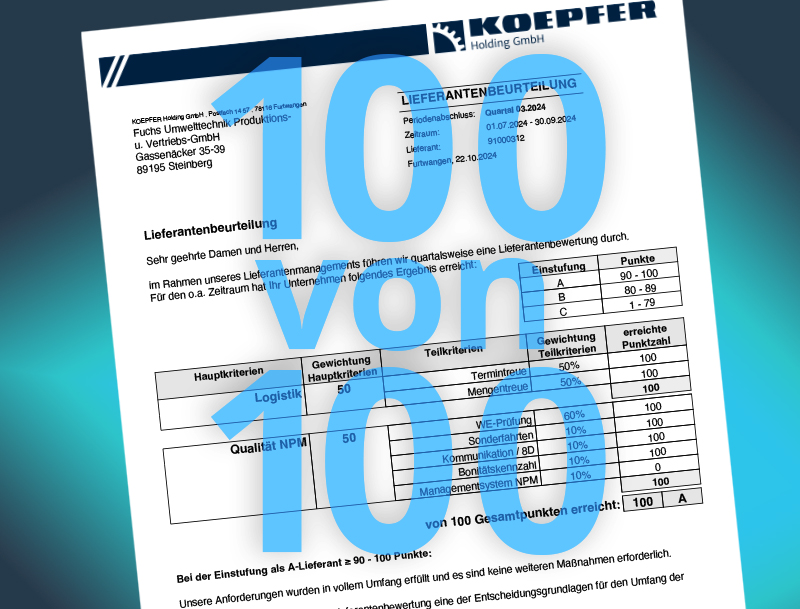 Neueste Lieferantenbewertung: 100 von 100 Punkte für Fuchs Umwelttechnik
